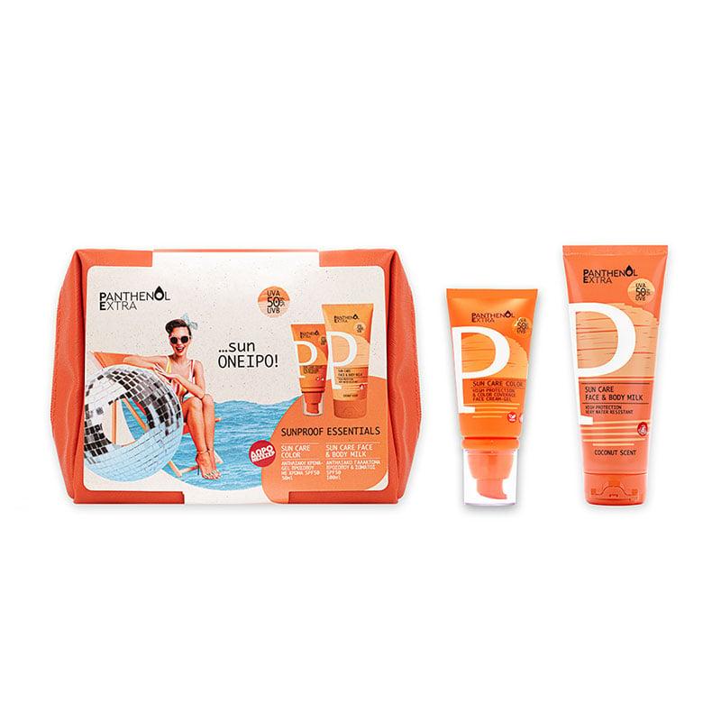 Το αντηλιακό σετ Sunproof Essentials Color SPF50 της Panthenol Extra περιέχει ένα αντηλιακή κρέμα-gel προσώπου με χρώμα SPF50 και ένα αντηλιακό γαλάκτωμα προσώπου & σώματος SPF50, και ένα μοναδικό νεσεσέρ που θα σας συνοδεύσουν στις καλοκαιρινές σας εξορμήσεις.