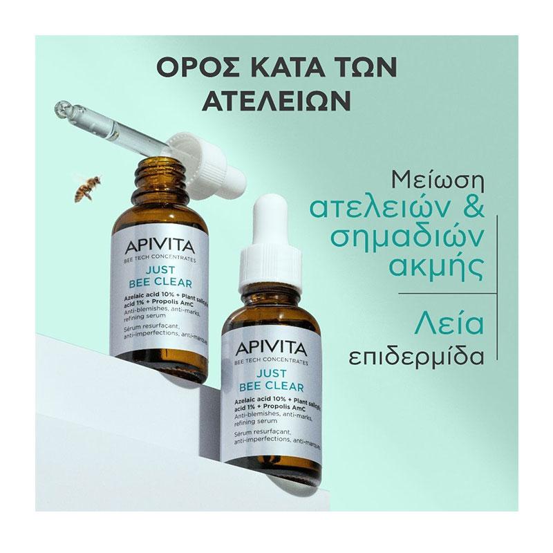 Ο Apivita Just Bee Clear Serum είναι ένας ορός προσώπου υψηλής αποτελεσματικότητας που αφήνει το λιπαρό δέρμα με τάση ακμής ορατά πιο καθαρό, απαλό και λείο. Ενισχυμένος με σύνθεση υψηλής αποτελεσματικότητας, περιέχει 10% Αζελαϊκό οξύ κατά των σημαδιών, 1% κερατολυτικό Φυτικό Σαλικυλικό οξύ και την αποκλειστική αντιμικροβιακή πατενταρισμένη Propolis AmC. Το λιπαρό δέρμα με τάση ακμής γίνεται ορατά πιο καθαρό, λείο και ομοιόμορφο. Μια διάφανη, λεπτόρρευστη σύνθεση που κλινικά αποδεδειγμένα: