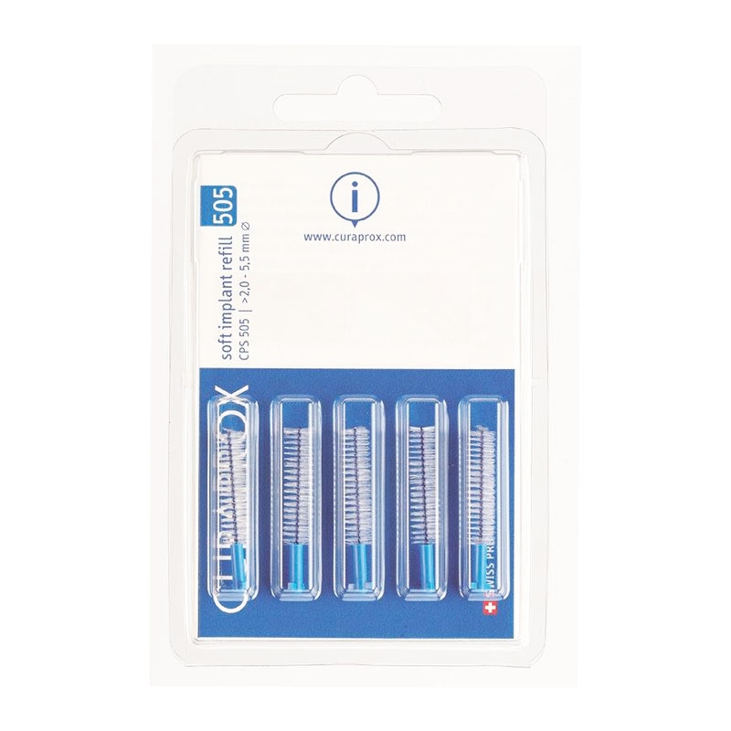 Συσκευασία ανταλλακτικών με 5 μεσοδόντια βουρτσάκια CPS 505 soft implant (για εμφυτεύματα) Ειδικά σχεδιασμένα μεσοδόντια βουρτσάκια με λεπτές και μακριές ίνες, για απαλό καθαρισμό των μεγάλων διαστημάτων μετά από περιοδοντική θεραπεία και για τα εμφυτεύματα. Η σειρά CPS soft implant προορίζεται αποκλειστικά για τέτοιες περιπτώσεις.
