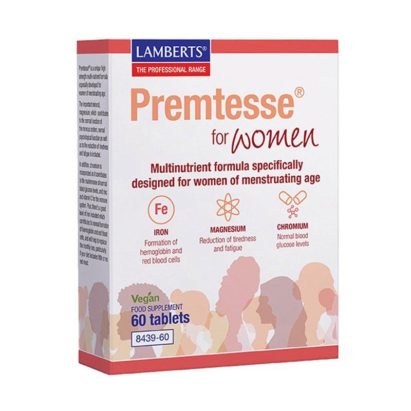 Premtesse για γυναίκες αναπαραγωγικής ηλικίας έχει σχεδιαστεί για καταστάσεις που σχετίζονται με διαταραχή της ισορροπίας των γυναικείων αναπαραγωγικών ορμονών, όπως το προεμμηνορησιακό σύνδρομο (PMS) και οι διαταραχές του καταμήνιου κύκλου. Περιέχει 21 μικροθρεπτικά συστατικά, όπως: