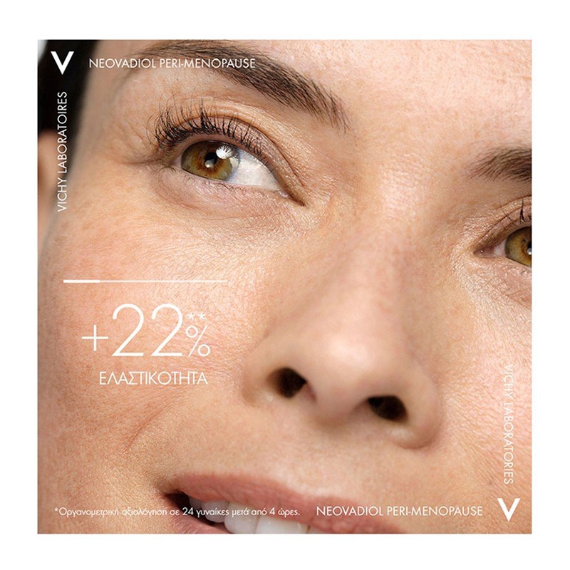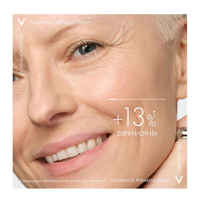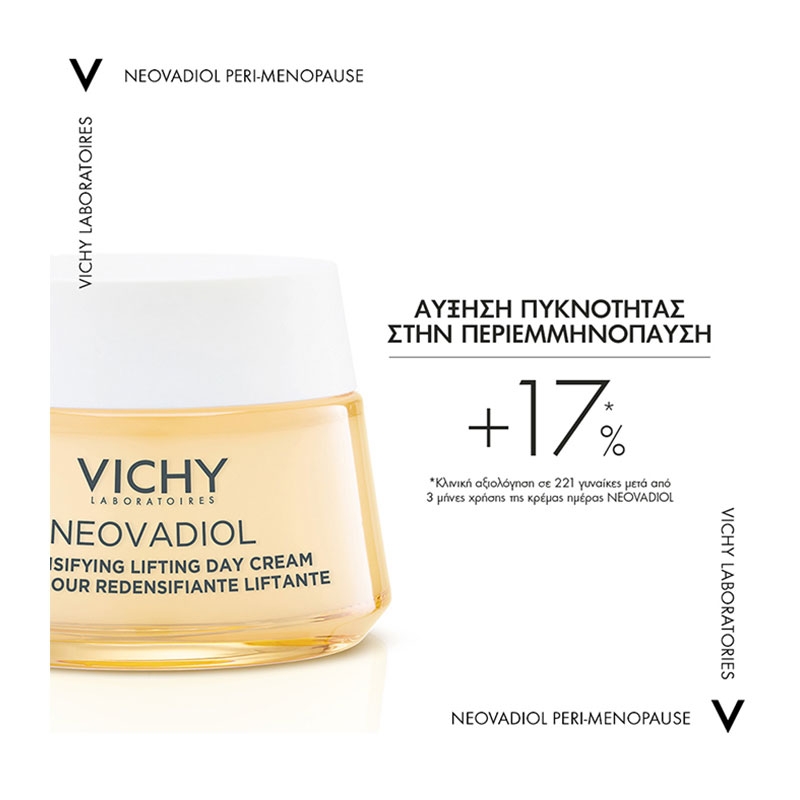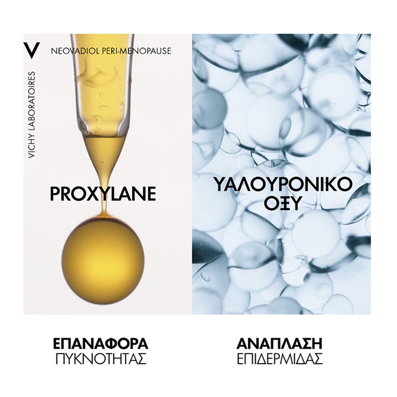 Τα εργαστήρια Vichy δημιούργησαν μια ελαφριά κρέμα που συνδυάζει το Ιαματικό Ηφαιστειακό Νερό Vichy φυσικά εμπλουτισμένο με 15 μεταλλικά στοιχεία , Proxylane, εκχύλισμα Cassia φυτικής προέλευσης και υαλουρονικό οξύ. Αντισταθμίζει τα ορατά σημάδια της περιεμμηνόπαυσης στην επιδερμίδα με στοχευμένη δράση ενάντια στην απώλεια πυκνότητας και στην αλλοίωση του περιγράμματος προσώπου.