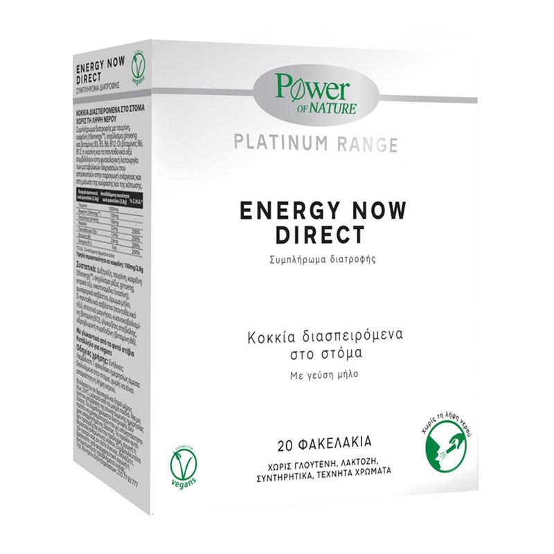 Το Energy Now Direct είναι σε νέα πρωτοποριακή μορφή κοκκίων που λαμβάνονται χωρίς τη λήψη νερού. Περιέχει ταυρίνη, καφεΐνη (Xtenergy™), εκχύλισμα ginseng και βιταμίνες Β3, Β5, Β6, Β12.