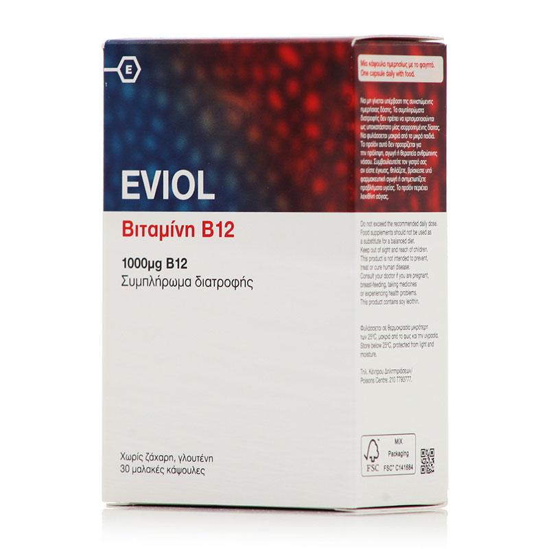 Το συμπλήρωμα διατροφής Eviol Vitamin B12 παρέχει στον οργανισμό 1000μg βιταμίνης Β12 (κυανοκοβαλαμίνης), μία από τις οκτώ βιταμίνες του συμπλέγματος Β, μια υδατοδιαλυτή βιταμίνη που εμπλέκεται στον μεταβολισμό κάθε κυττάρου του ανθρώπινου σώματος, συμπαράγοντας στη σύνθεση του DNA και στον μεταβολισμό λιπαρών οξέων και αμινοξέων και ιδιαίτερα σημαντική για τη φυσιολογική λειτουργία του νευρικού συστήματος μέσω του ρόλου του στη σύνθεση της μυελίνης, όπως επίσης και στην ωρίμανση των ερυθρών αιμοσφαιρίων στον μυελό των οστών.